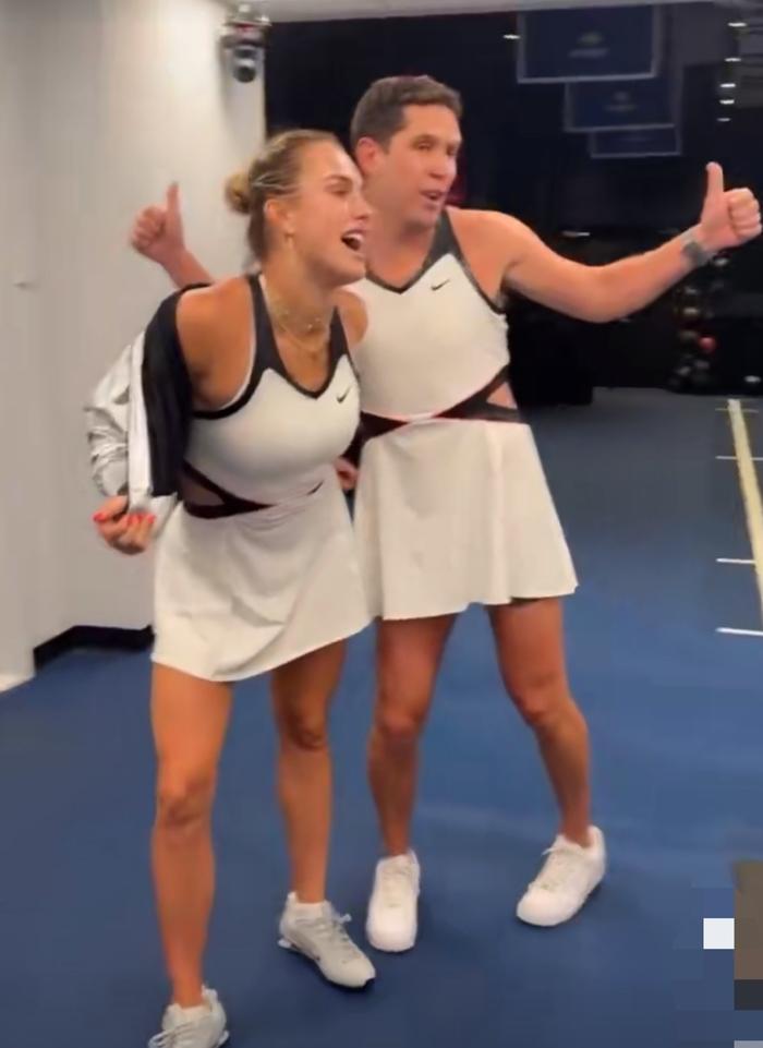 私底下和团队一起庆祝时,萨巴伦卡更是放出了一个超级大招。直接让自己的团队男成员穿上自己的美网战袍扮自己,那画风的劲爆程度,很多人将之形容为,“隔着屏幕都想疯狂尖叫,太会玩,也太敢玩了。”