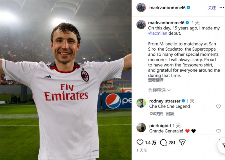 范博梅尔写道:“15年前的今天,我完成了在AC米兰的首秀。”