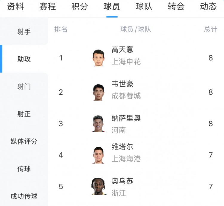 9月1日中超快讯 在刚刚结束的中超第23轮赛事中,成都蓉城球员韦世豪与河南队外援纳萨里奥双双贡献关键助攻,两人本赛季助攻数已达8次,追平上海申花的高天意,三人共同领跑中超助攻榜。