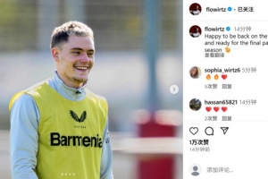 体育资讯4月9日讯 勒沃库森球员维尔茨在个人社媒晒出自己恢复训练的照片,配文写道:“很高兴重回球场,已经准备好参加赛季冲刺阶段的比赛了。”