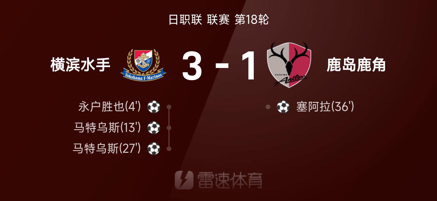 05月25日讯 25赛季日职联联赛第18轮,横滨水手3-1战胜鹿岛鹿角。全场比赛,马特乌斯上演梅开二度,永户胜也破门建功,塞阿拉破门难救主。