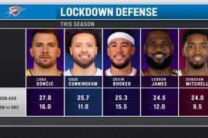 体育资讯03月30日讯 转播方晒出了多名球星本赛季对阵雷霆时数据与赛季平均数据的对比。